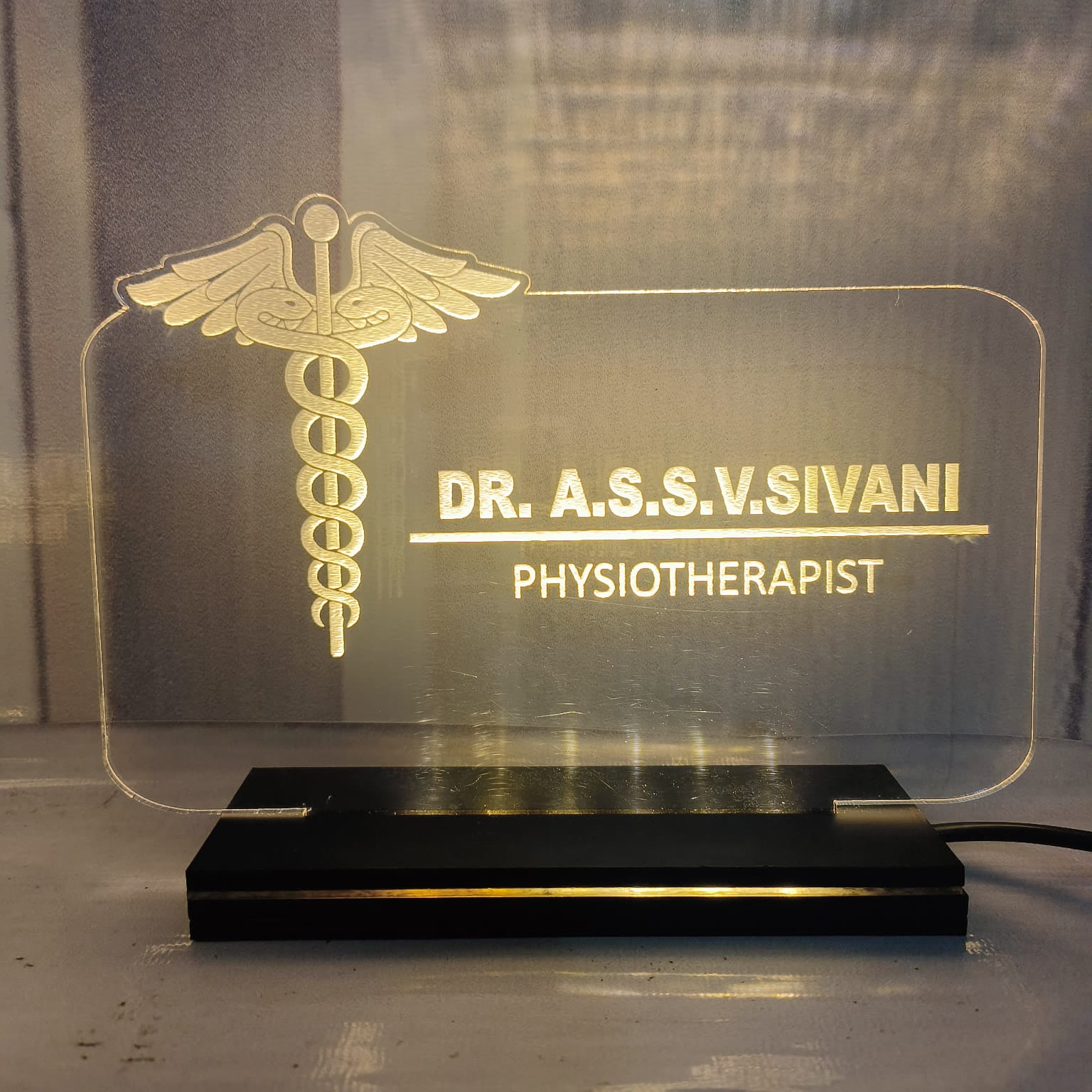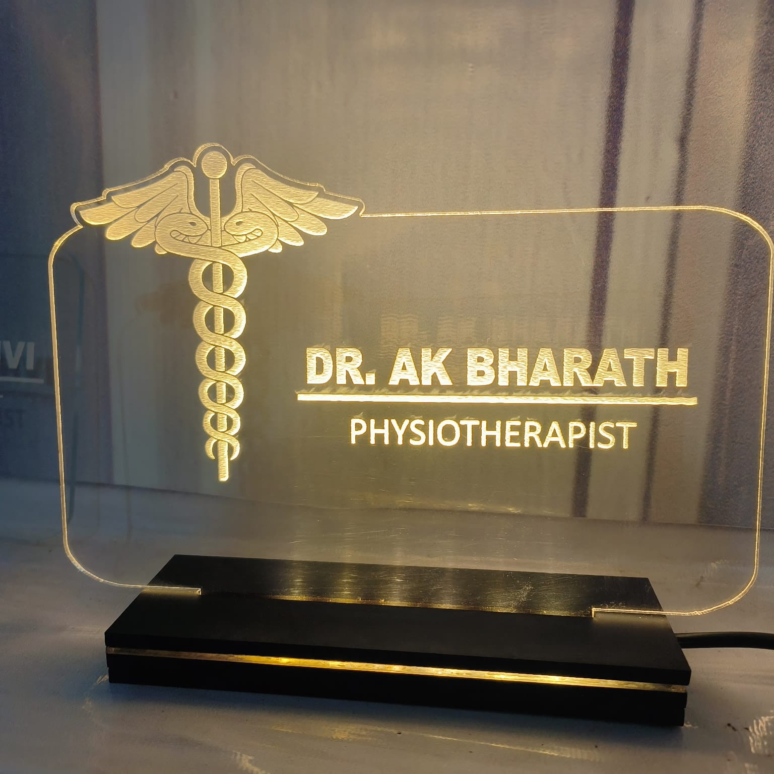Made from high-quality transparent acrylic with LED illumination, this name plate is ideal for clinic desks, consultation tables, and office workstations. The clear engraving and soft lighting make the name, degree, and designation easy to read while maintaining a premium appearance.