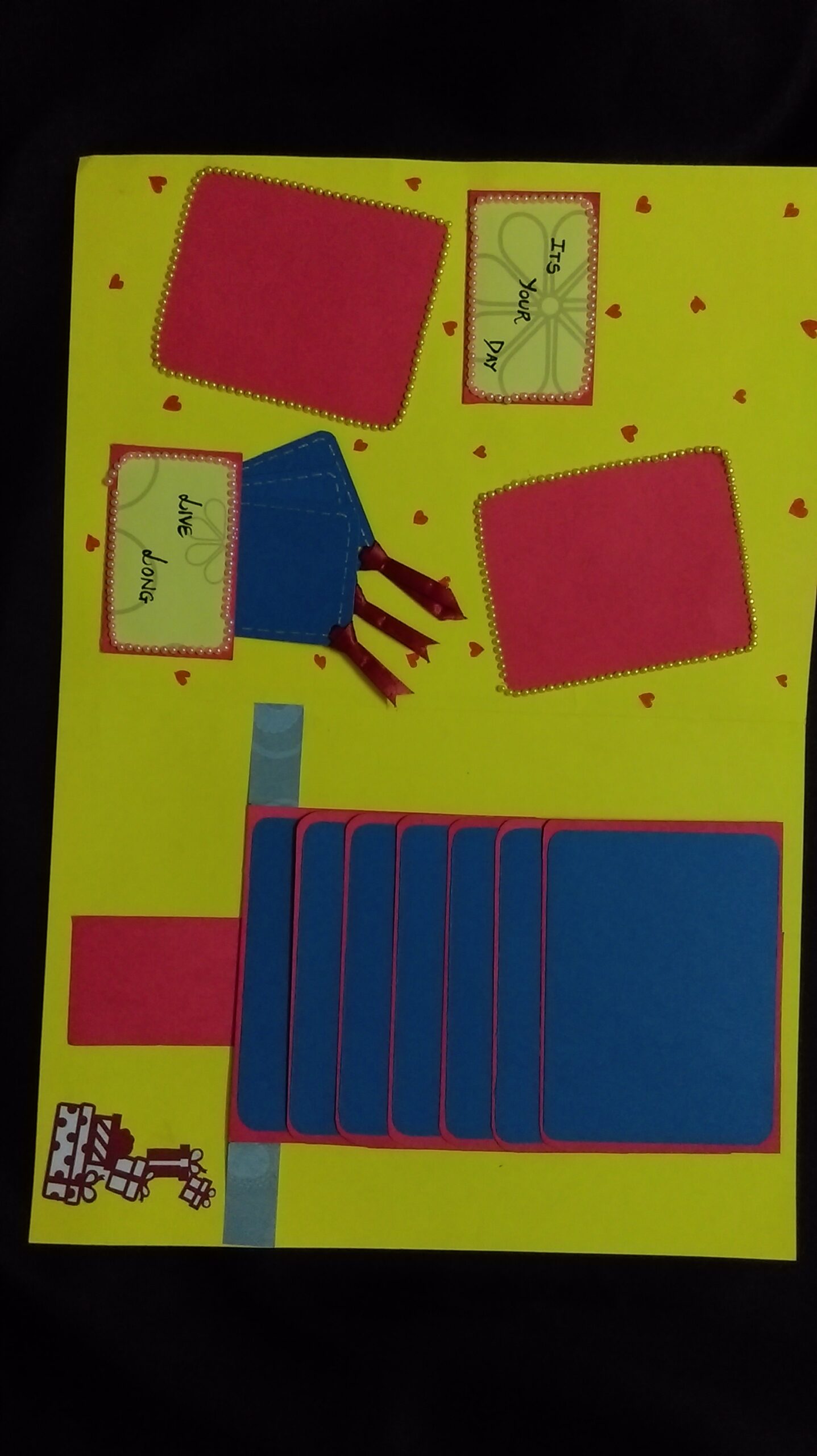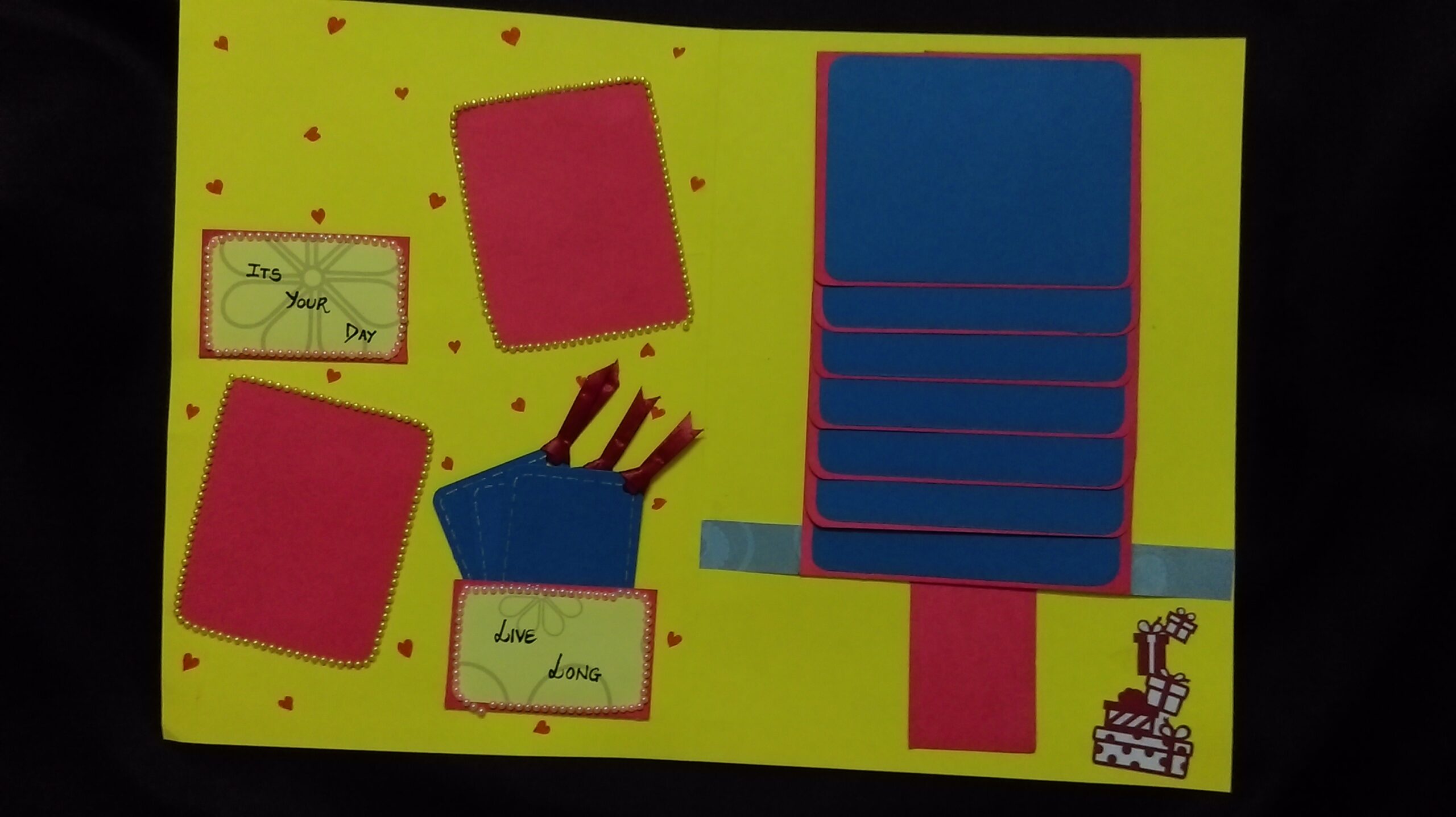 The scrapbook have a 3d gift popup inside which looks like a real one and also this scrapbook is very interactive in itself.