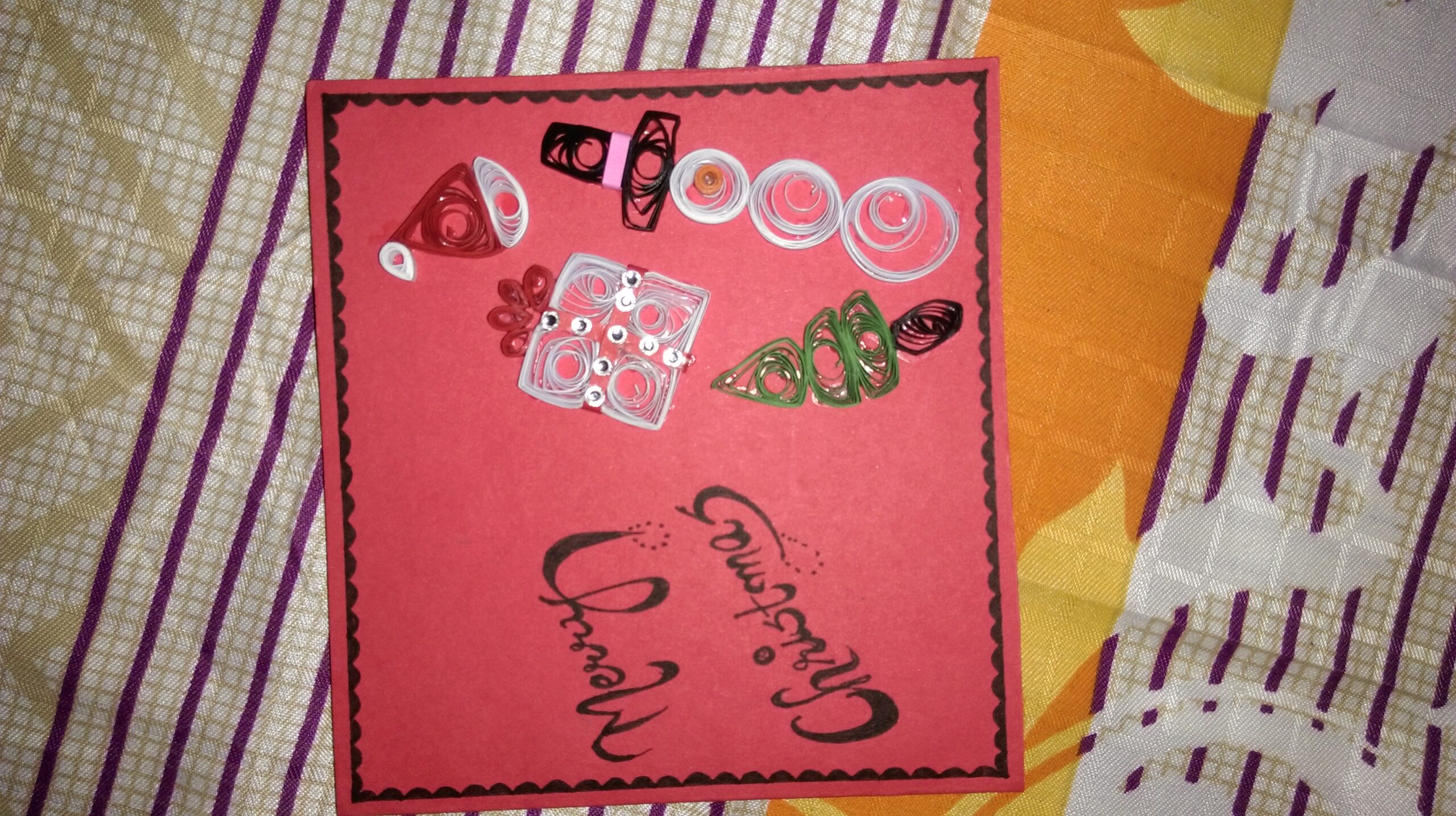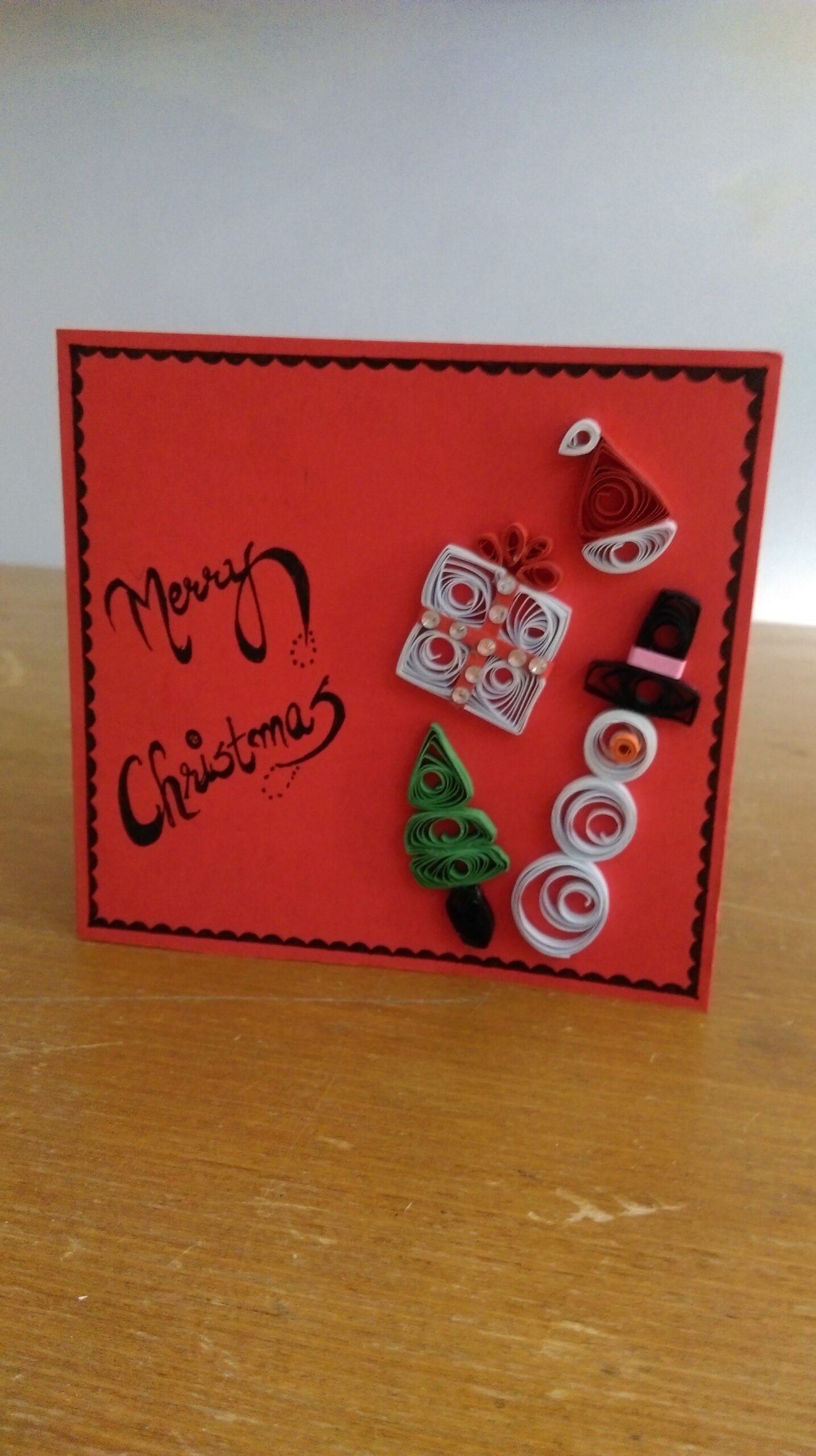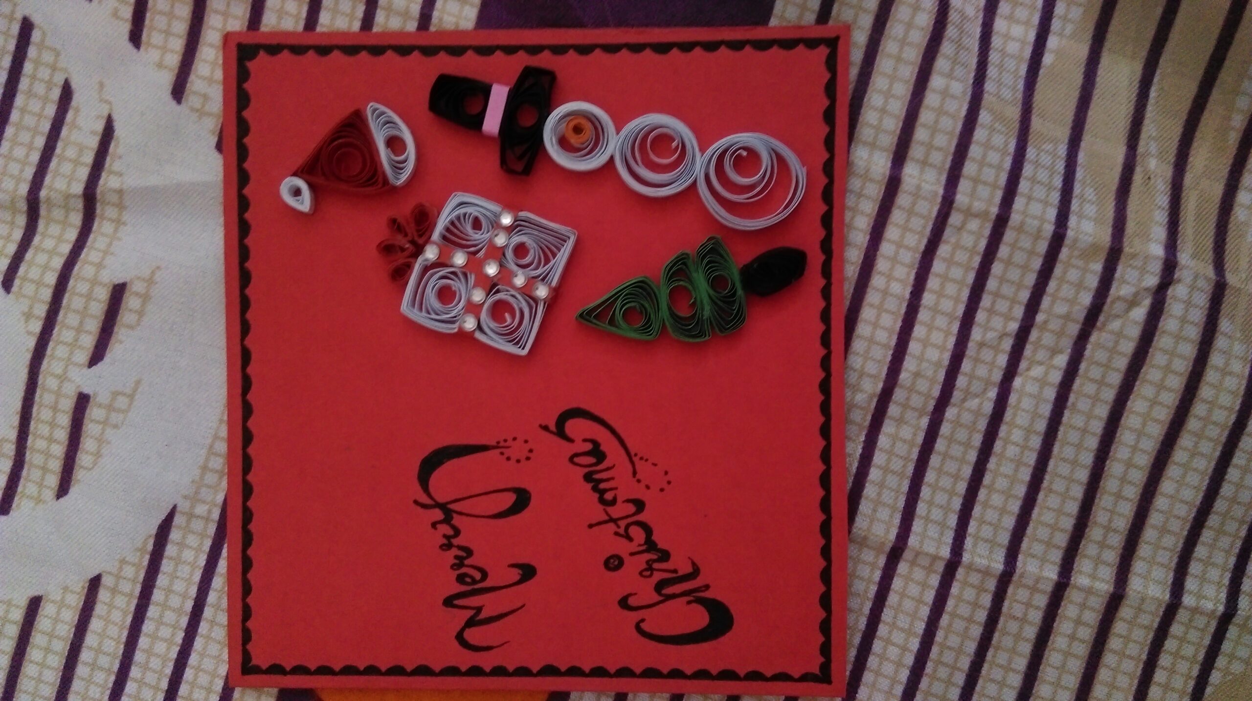 A Quilled handmade christmas card with quilled tree, cap and gift..Grab it for ur loved ones..